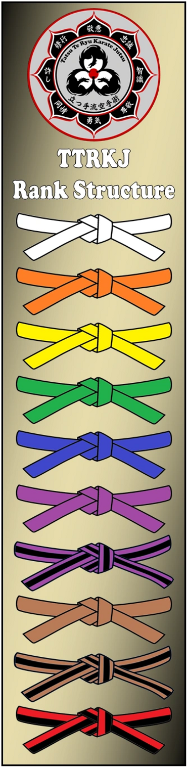 As a reflection of the their knowledge and skills, Tatsu Te Ryu Karate-Jutsu utilizes a belt ranking system and these belts are only awarded to students who have tested in front of a qualified instructor and have proven themselves proficient in the specialized skills of the system.